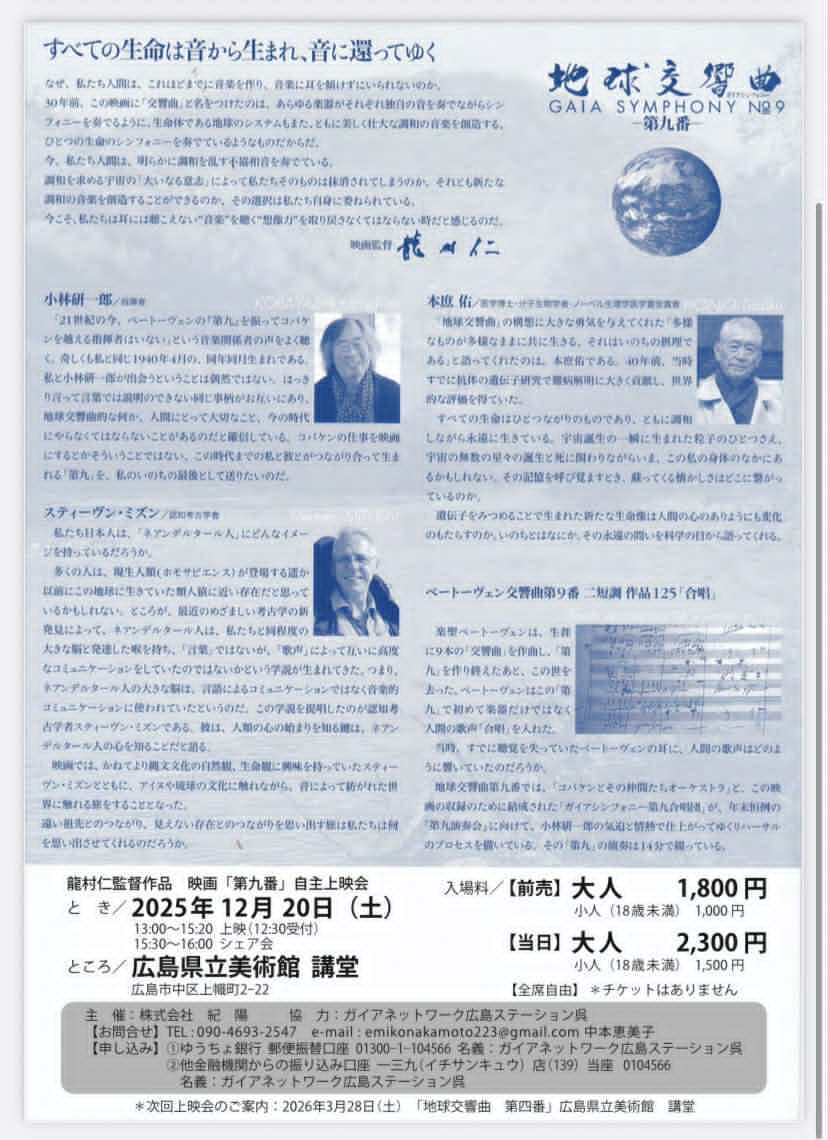 | 〔問い合わせ〕 | ガイアネットワーク広島ステーション呉 中本恵美子 090-4693-2547 emikonakamoto223@gmail.com ☆次回上映会の予定 2026年3/28(土)「第四番」 |