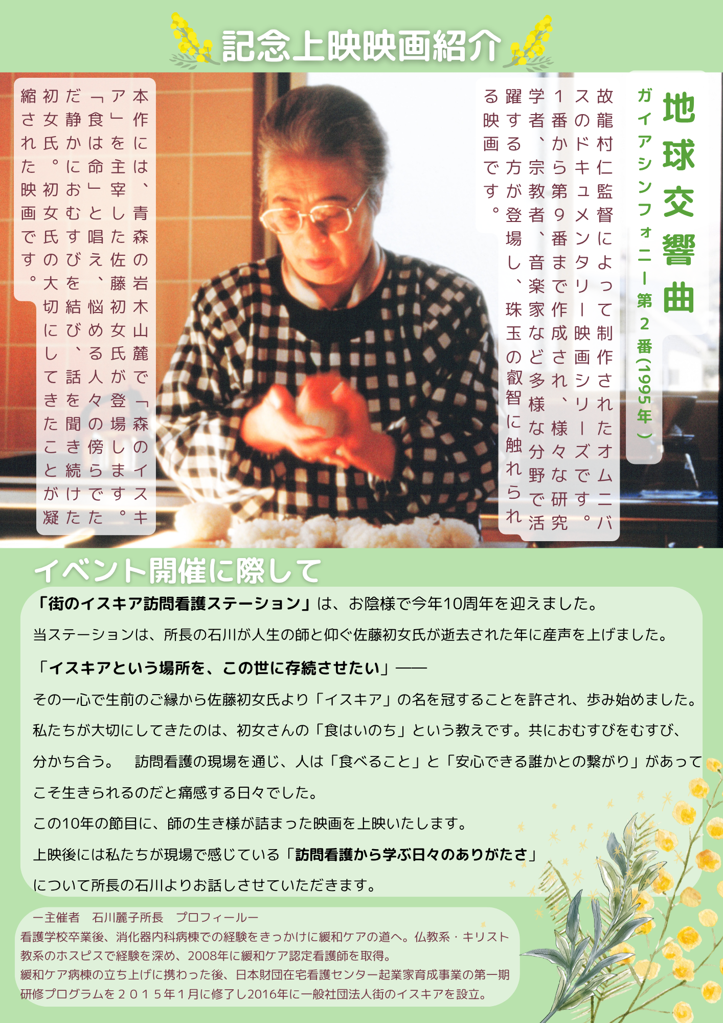 | 〔開催日〕 | 2026年6月20日(土)14:00~16:10 13:40 開場・受付開始 14:00~14:55 上映 地球交響曲第二番・佐藤初女篇 15:10~16:00 街のイスキア訪問ナースステーション所長による記念講演 16:00~16:10 スペシャルゲスト アカペラグループ6keysによる演奏 |